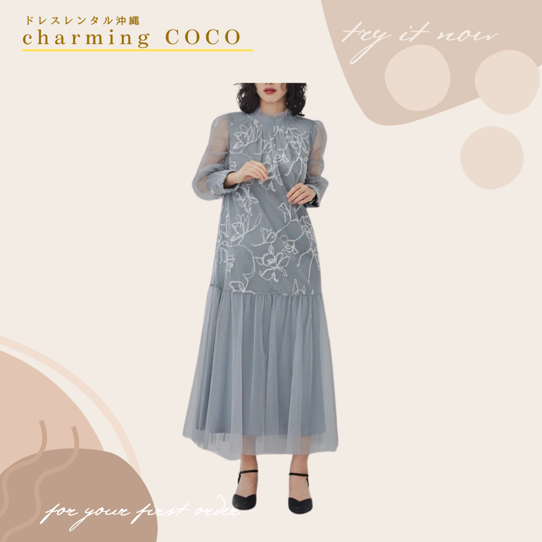 立体感のあるフェザー糸とラメ糸を組み合わせたフラワー刺繍がポイントのドレス👗🫧